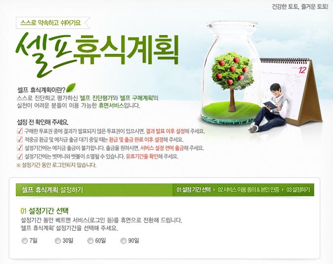 체육진흥투표권 수탁사업자 스포츠토토의 공식 온라인 발매 사이트 베트맨(www.betman.co.kr)은 오는 12일부터 체육진흥투표권 구매를 고객 스스로 구매 한도를 설정해 보다 더 건전하게 게임을 즐길 수 있는 '셀프휴식계획' 서비스를 런칭한다고 밝혔다.