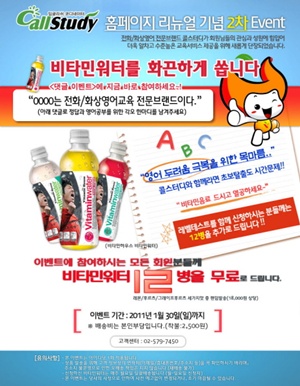 콜스터디 회원이라면 누구나 참여 가능하며 31일까지 이벤트에 응모한 전원에게 비타민하우스의 비타민워터 12병을 무료로 제공한다. 이벤트는 제품 물량 소진 시 마감된다.