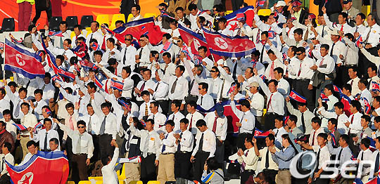 흡사 이들의 응원은 70~80년대 국내 축구장 혹은 야구장에서 볼 수 있었던 스타일이었다. 북한의 특징답게 '이겨라! 이겨라! 우리 선수 이겨라!' 등을 외치며 열심히 응원을 펼쳤다.