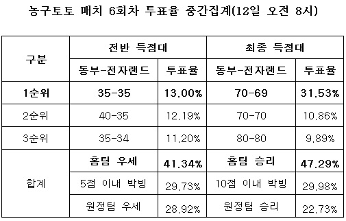 오리온그룹 계열의 스포츠토토 공식 온라인 발매사이트인 베트맨(www.betman.co.kr)이 오는 13일 오후 7시 원주 치악체육관에서 진행되는 동부-전자랜드전 대상 농구토토 매치 6회차 투표율을 중간 집계한 결과, 전체 참가자의 47.29%는 동부가 전자랜드에 근소한 우세를 보일 것으로 전망했다.