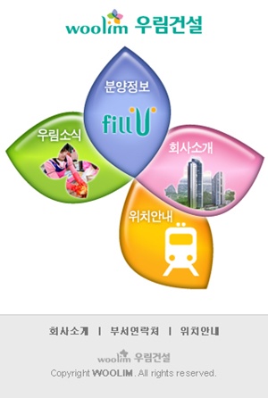 우림건설의 모바일 홈페이지는 회사의 로고에 포함돼 있는 4개의 꽃잎을 형상화해 메뉴별 콘텐츠로 들어갈 수 있도록 디자인돼 마치 별도의 스마트폰 애플리케이션을 접하는 듯한 고급스러운 느낌을 부여했다.