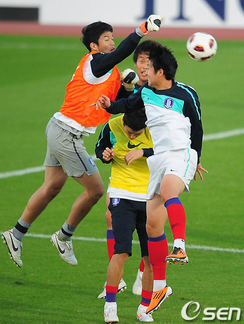 미니게임중 손흥민이 헤딩슛을 날리려 할때 정성룡 골키퍼가 달려나와 펀칭을 하고 있다./rumi@osen.co.kr