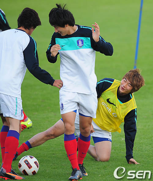 미니게임중 기성용이 자신의 목을 걸어 넘어트린 지동원에게 환하게 웃으며 말을 걸고 있다./rumi@osen.co.kr