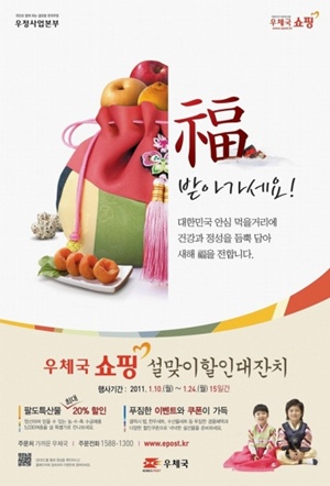 [이브닝신문/OSEN=정은진 기자] 우체국 쇼핑이 다가오는 설을 맞아 국내 팔도특산물을 최고 20% 할인 판매한다. 지식경제부 우정사업본부는 오는 24일까지 ‘우체국쇼핑 설맞이 할인 대잔치’를 연다고 11일 밝혔다.