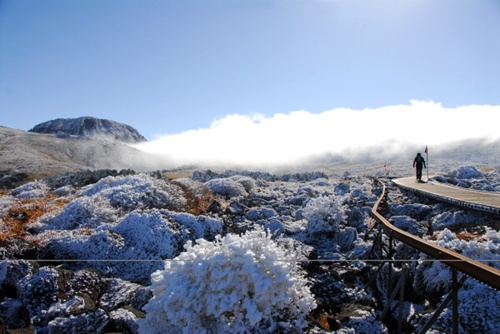 제주도 애월읍에 있는 한라산 선작지왓은 1월 이맘때쯤이면 눈부신 설국으로 탈바꿈한다. 선작지왓 평원은 국내에 흔치 않은 고산 평원이다. 영실코스는 평원으로 오르는 가장 빠른 길이자 ‘신들이 사는 곳’이라는 신비감을 주는 곳. 코스가 끝나는 곳에는 윗세오름 대피소가 있고 대피소 매점엔 1월 설원을 즐기러 온 사람들만큼이나 컵라면이 수북하다.