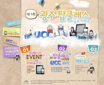 이미 진행 중인 세 번째 이벤트는 광주탑클래스 기숙학원의 안내책자를 받고 인증샷을 홈페이지에 올리면 된다. 선정된 학생들에겐 아이패드와 아이팟터치의 상품을 받을 수 있으며 2011년 2월 12일까지 진행된다.