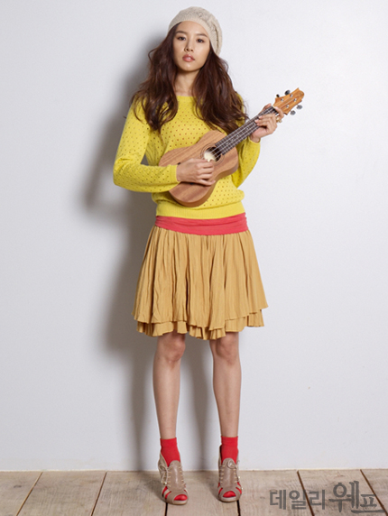 첫 번째로 따뜻하면서, 열정적인 뮤지션으로의 변신을 담아냈다. 봄의 대표 컬러인 오렌지와 옐로우 컬러로 여성들이 따라 하고 싶은 러블리한 스타일링을 멋지게 연출했다. 라운드 니트와 무릎길이의 플레어스커트를 매치한 룩은 컬러에 포인트를 주어, 봄의 따뜻한 느낌을 살렸다.