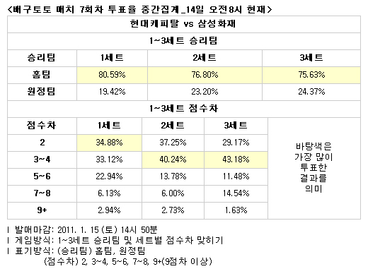 2010-11시즌 프로배구 대상 배구토토 매치 7회차 중간집계 결과. 1~3세트 모두 현대캐피탈 승리 예상…15일(토) 발매 마감