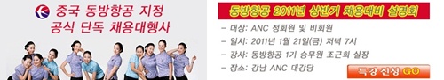 중국동방항공 단독채용대행기관인 ANC승무원학원에서 동방항공 승무원채용대비 설명회를 진행한다. ANC스튜어디스학원은 싱가포르항공 단독채용에 이어 지난 12월 중국동방항공의 지상직 채용대행을 진행한 바 있다.