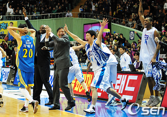 경기 종료 후 허재 감독과 KCC 선수들이 기뻐하고 있다. /sunday@osen.co.kr