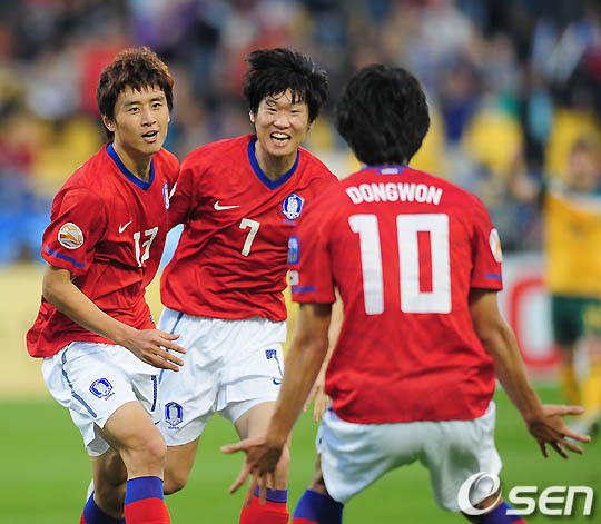 전반 구자철이 지동원의 어시스트를 골로 연결한 후 박지성과 기쁨을 나누고 있다. /rumi@osen.co.kr
