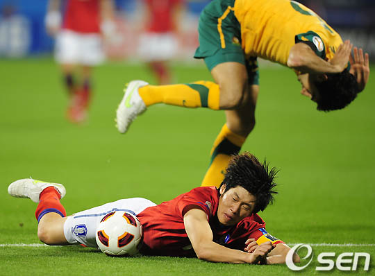 후반 박지성이 호주 문전에서 호주 수비의 발에 걸려 넘어지고 있다. /rumi@osen.co.kr