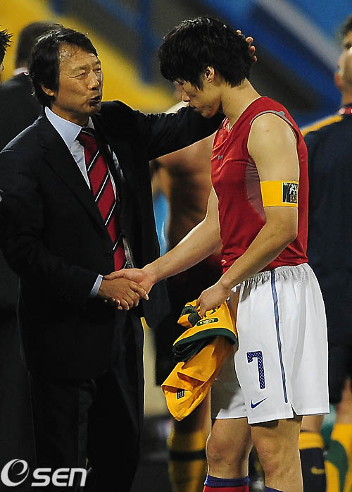 경기를 마치고 조광래 감독이 박지성을 격려하고 있다./rumi@osen.co.kr