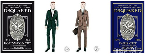 <사진. 그린 수트 - 디스퀘어드² 수트 컬렉션 헐리우드 모티브(왼쪽)와 브라운 수트- 디스퀘어드² 수트 컬렉션 파리 모티브>