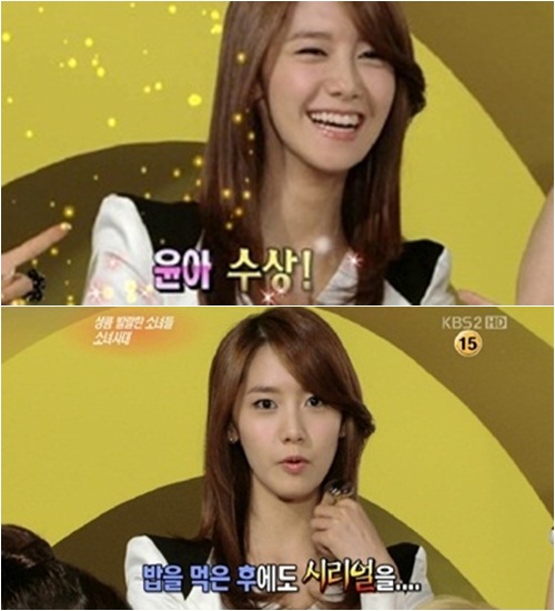 윤아는 15일 방송된 KBS 2TV '연예가중계'에서 소녀시대 멤버들 중 식신을 뽑아달라는 리포터의 요청에 멤버들에게 지목 당했다.