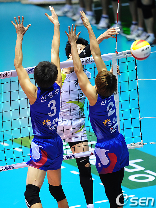 2세트 우리캐피탈 안준찬이 대한항공 신경수와 한선수의 블로킹을 피해 공격을 시도하고 있다. /sunday@osen.co.kr