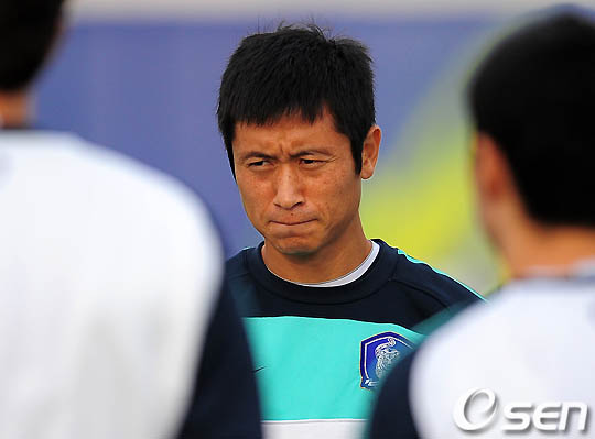 이영표가 조광래 감독의 조회때 비장한 표정을 짓고 있다./rumi@osen.co.kr
