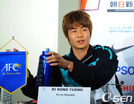 기성용이 기자회견을 시작하며 물병을 치우고 있다./rumi@osen.co.kr