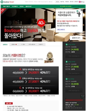 야놀자가 새롭게 선보인 커플티켓(ticket.yanolja.com)은 최근 전국을 강타한 쇼핑, 공연, 음식점이 주류인 소셜커머스에 데이트코스와 모텔을 접목한 새로운 놀이문화 공간을 제시한다.