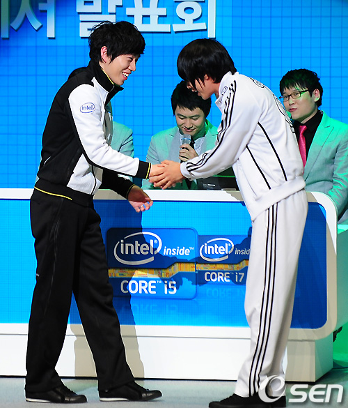 프로게이머 임요환과 이윤열이 스타크래프트2 매치 후 악수를 나누고 있다. /sunday@osen.co.kr