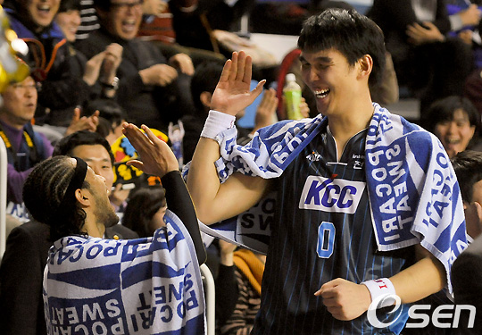 경기종료 직전 KCC 하승진과 전태풍이 하이파이브를 하고 있다./ soul1014@osen.co.kr