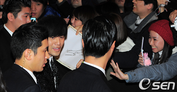 주걸륜이 보안요원의 경호를 받으며 팬들에게 사인을 하고 있다. /jpnews@osen.co.kr