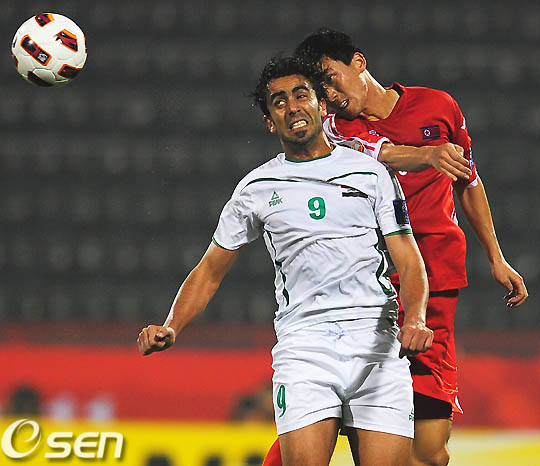 후반 북한 리강춘이 이라크 무스타파 카림과 공중볼 다툼을 하고 있다. /rumi@osen.co.kr