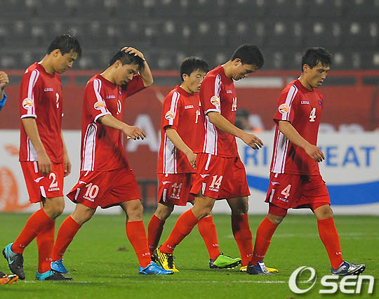 경기를 마치고 북한 선수들이 고개를 숙인채 그라운드를 빠져나가고 있다. /rumi@osen.co.kr