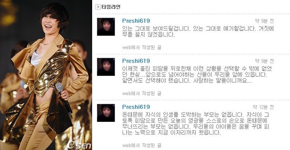 니콜의 어머니 김 모씨는 20일 자신의 트위터에 "돈 때문에 자식의 인생을 도박하는 부모는 없습니다. 자식이 그토록 피땀으로 만든 오늘의 영광을 스스로의 손으로 돈때문에 무너뜨리는 부모는 없습니다"라고 심경을 고백했다.