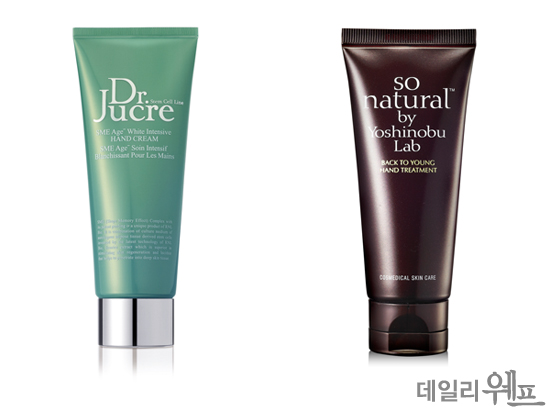 <사진. 닥터 쥬크르_에스엠이 에이지마이너스 화이트 인텐시브 캐어 핸드크림(왼쪽), 쏘내추럴_백 투 영 핸드 트리트먼트>
