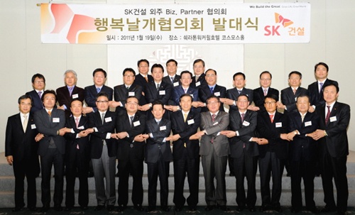 [이브닝신문/OSEN=정은진 기자] SK건설은 지난 19일 서울 광진구 워커힐호텔에서 협력업체와의 정례적인 협의회인 ‘행복날개협의회 발대식’을 가졌다. 사진은 SK건설 윤석경 부회장(앞줄 오른쪽 여섯번째)을 비롯한 SK건설 임원과 협력업체 대표들이 행사 후 기념촬영을 하고 있는 모습. 사진제공=SK건설