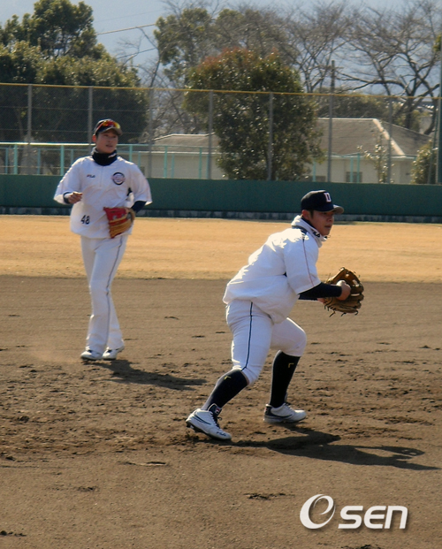 22일 오전 두산 베어스의 전지훈련 캠프가 펼쳐진 일본 오이타현 벳푸 시민구장. 두산 3루를 놓고 치열한 경쟁 중인 윤석민(26)과 이원석(25)은 김민호 수비코치가 때려내는 펑고를 받으며 수비 훈련에 몰두했다.