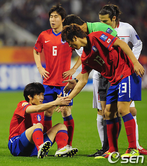 전반 쓰러져 있는 박지성을 구자철이 일으켜세우고 있다. /rumi@osen.co.kr