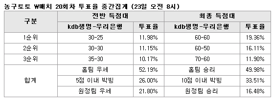 2010-2011시즌 농구토토 W매치 20회차 투표율 중간집계 결과 전반전 kdb생명 우세 52.19%…최종 득점대 60-60점대 박빙승부 19.36%