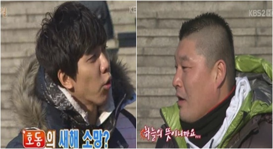 23일 방송된 KBS 2TV 주말 버라이어티 '해피선데이-1박2일'에서는 2011년 첫 녹화분 '겨울 산장 여행' 편이 전파를 탔다. 이날 오프닝에서 강호동은 "오늘이 새해 첫 녹화다. 새해 복 많이 받으시라"며 동생들에게 새해 인사를 건넸다.