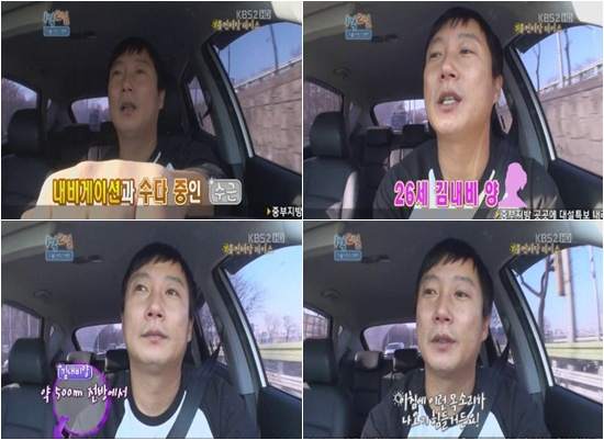 이수근은 운전 경로를 친절하게 알려주는 내비게이션 속 여자의 목소리에 "친절하시다. 감사하다. 아침에 이런 목소리가 나오기 힘든 데 아주 예쁘시다"며 칭찬을 늘어놓는 가하면 안내 멘트 하나하나에 일일이 대답을 하며 마치 누군가와 대화를 하는 듯한 장면을 연출, 폭소를 자아냈다.