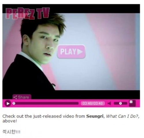 힐튼은 지난 21일(현지시각) 자신의 블로그 '페레즈힐튼닷컴'에 승리의 신곡 '어쩌라고(What can I do)' 뮤직비디오를 올리고 "승리의 뮤직비디오 '어쩌라고?'를 봐라(Check out the just-released video from Seungri, What can I Do?)"는 글을 덧붙였다.