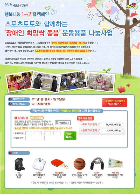 행복나눔 캠페인은 매달 1000만 원을 목표로 스포츠토토 팬들의 기부금을 모아 어려운 이웃을 돕는 이벤트다. 두 달간 적립된 2000만원의 기부금은 '장애인 희망싹 돋음' 운동용품 나눔사업 후원금으로 사용될 예정이다.