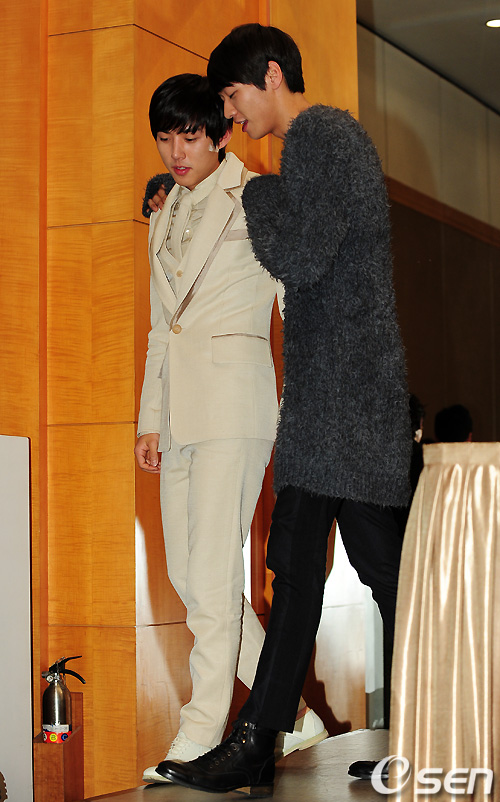 배우 백성현, 김영광이 기자간담회를 마치고 무대를 내려가고 있다. /sunday@osen.co.kr