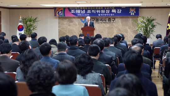 <사진>조해녕 조직위원장이 24일 중구청 공무원을 상대로 특강에 나섰다./대구세계육상조직위 제공.