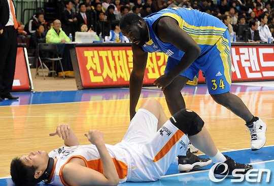 4쿼터 삼성 딕슨이 몸싸움 중 넘어진 전자랜드 서장훈에게 손을 내밀고 있다. /soul1014@osen.co.kr