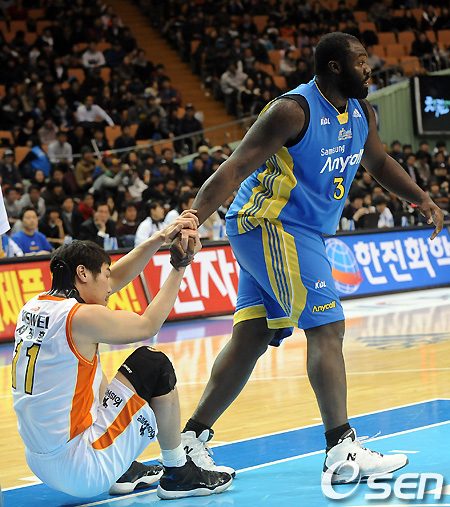 4쿼터 삼성 딕슨이 몸싸움 중 넘어진 전자랜드 서장훈에게 손을 내밀고 있다. /soul1014@osen.co.kr