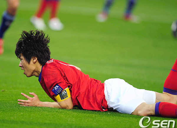 전반 박지성이 일본 수비에 걸려 넘어지고 있다 . /rumi@osen.co.kr