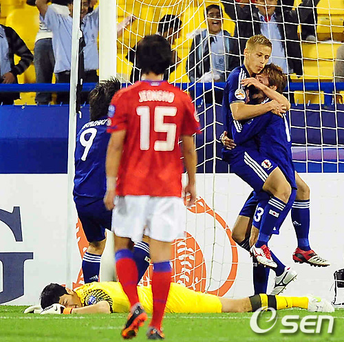 연장 전반 황재원이 반칙으로 내준 페널티킥을 정성룡이 잘 막있지만 흘러나온 볼을 일본 호소가이가 넣고 기쁨을 나누고  있다 . /rumi@osen.co.kr