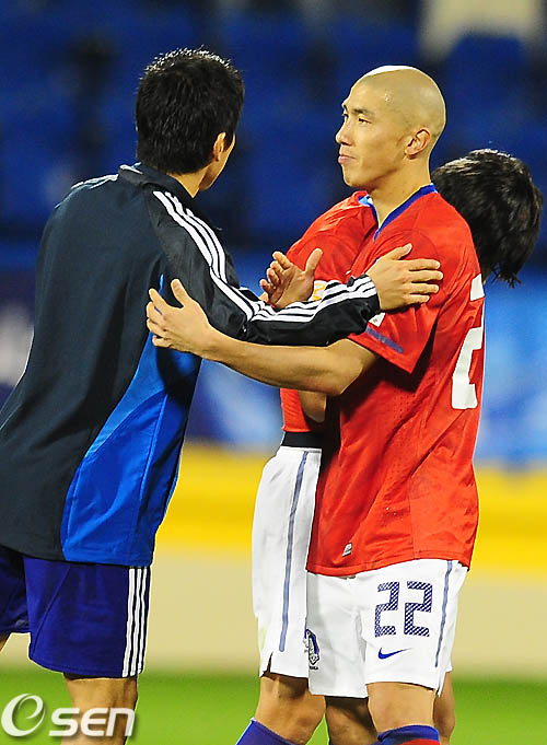 경기를 마치고 차두리가 하세베 마코토와 포옹을 하고 있다./rumi@osen.co.kr