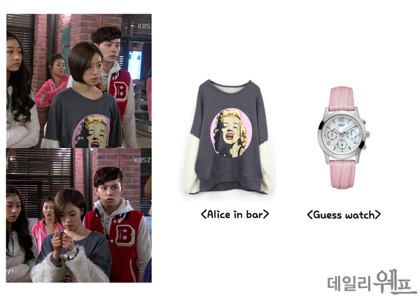 긴 머리를 단발로 자르고, 패션 스타일에서도 변화를 보여준다. 그녀는 러블리한 컬러의 시계를 단조로운 교복과 매치해 시계 하나만으로도 멋진 윤백희 프레피 룩을 완성시켰다. 파스텔 톤의 밴드로 된 게스 워치의 미니 스펙트럼 라인은 빛의 흐름에 따라 달라 보이는 자개를 사용해, 심플한 윤백희 룩의 포인트로도 제격이다.