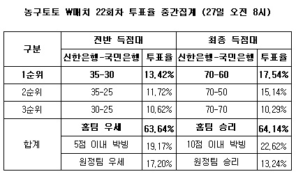 체육진흥투표권 수탁사업자인 오리온그룹의 스포츠토토 공식 온라인 발매사이트 베트맨(www.betman.co.kr)은 28일 오후 5시 경기도 안산시 와동체육관에서 열리는 2010~2011시즌 여자프로농구 신한은행-국민은행전을 대상으로 한 농구토토 W매치 22회차 투표율 중간집계 결과, 전체 참가자의 64.14%는 신한은행이 국민은행을 상대로 우세한 경기를 펼칠 것으로 전망했다고 밝혔다.