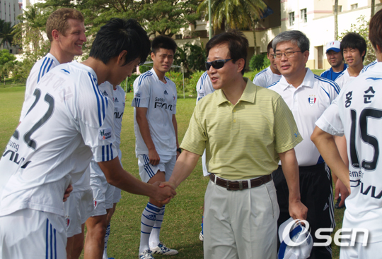 [OSEN] 전지 훈련에 참가 중인 삼성 라이온즈 선수단을 격려하기 위해 괌에 머무르고 있는 김인 삼성 라이온즈 사장이 27일 삼성 라이온즈와 함께 훈련 중인 수원 블루윙스 축구단을 격려했다.