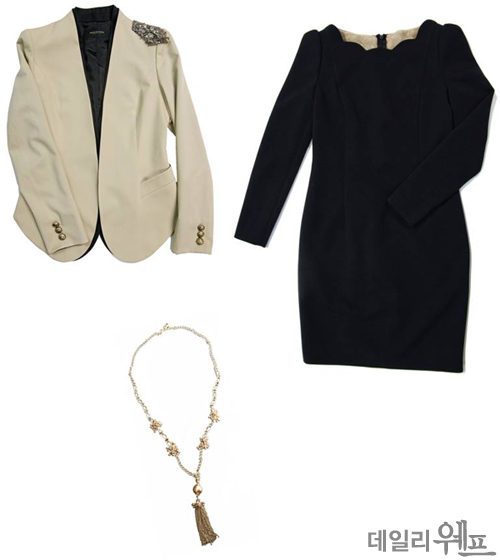 'H'라인의 ‘미니멈’의 블랙 원피스는 독특한 네크라인과 목 뒤 부분에 레이스를 덧대어 단아하고, 고급스럽게 스타일링 했다. 여기에 칼라 없는 베이지 재킷을 입어 세련된 도시 여성의 면모를 뽐내자. ‘모조에스핀’의 베이지 재킷은 이중 칼라로 되어있어 고급스러움을 더하고, 금장버튼과 탈부착 가능한 어깨 장식은 화려함이 느껴진다.