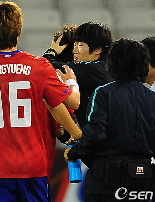 전반 선취골을 넣은 구자철이 벤치에 있는 박지성에게 달려가 안기고 있다./rumi@osen.co.kr